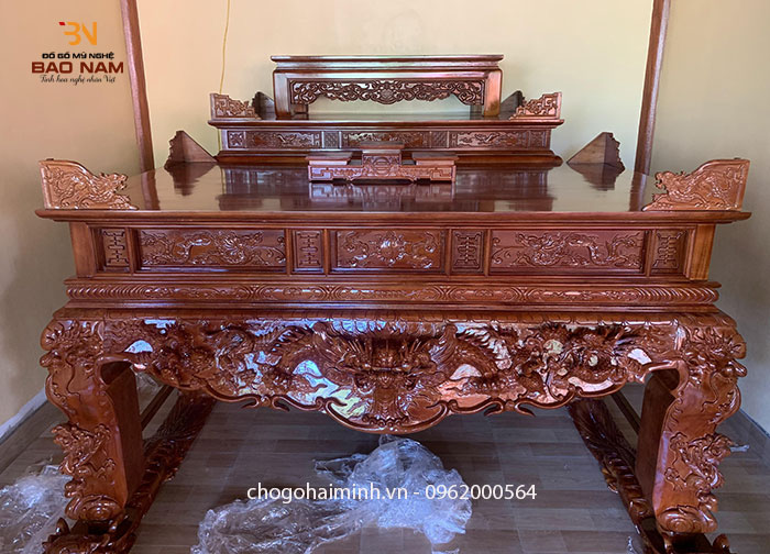 Đặc biệt hơn sập thờ tứ linh mà làm bằng gỗ gõ đỏ này thì chất lượng hơn. Bởi chất gỗ sáng, tom gỗ mịn, vân gỗ đẹp, không lứt lẻ không cong vênh, thường có giá thành rất cao, lên được nhiều người lựa chọn sử dụng. Đây là loại gỗ quý, được các vua chúa, quý tộc ngày xưa sử dụng, làm đồ nội thất trong gia đình.